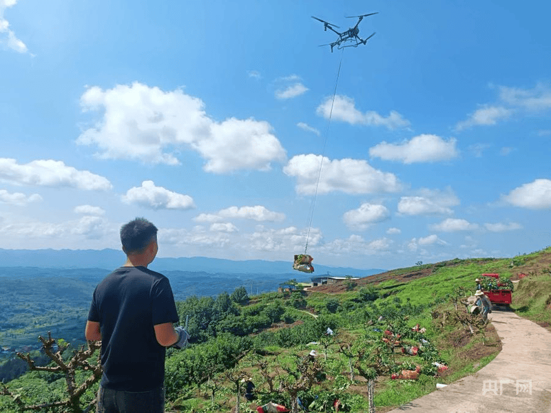 田间,两台大型无人机腾空而起,“嗡嗡”声一飞冲天,150斤花椒如乘筋斗云,从枝头直抵货车车厢。